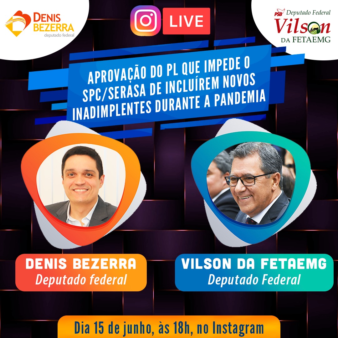 Em seguida, às 18 horas, pelo instagram, o deputado federal Denis Bezerra e Vilson da Fetaemg (PSB-MG) participam de um bate-papo a respeito do projeto de lei 675/20 que suspende por 90 dias a inscrição de consumidores em bancos de informação como o SPC e Serasa, registrada após o dia 20 de março deste ano, ou seja, que esteja relacionado aos impactos econômicos provocados por medidas de isolamento adotadas no combate a pandemia.