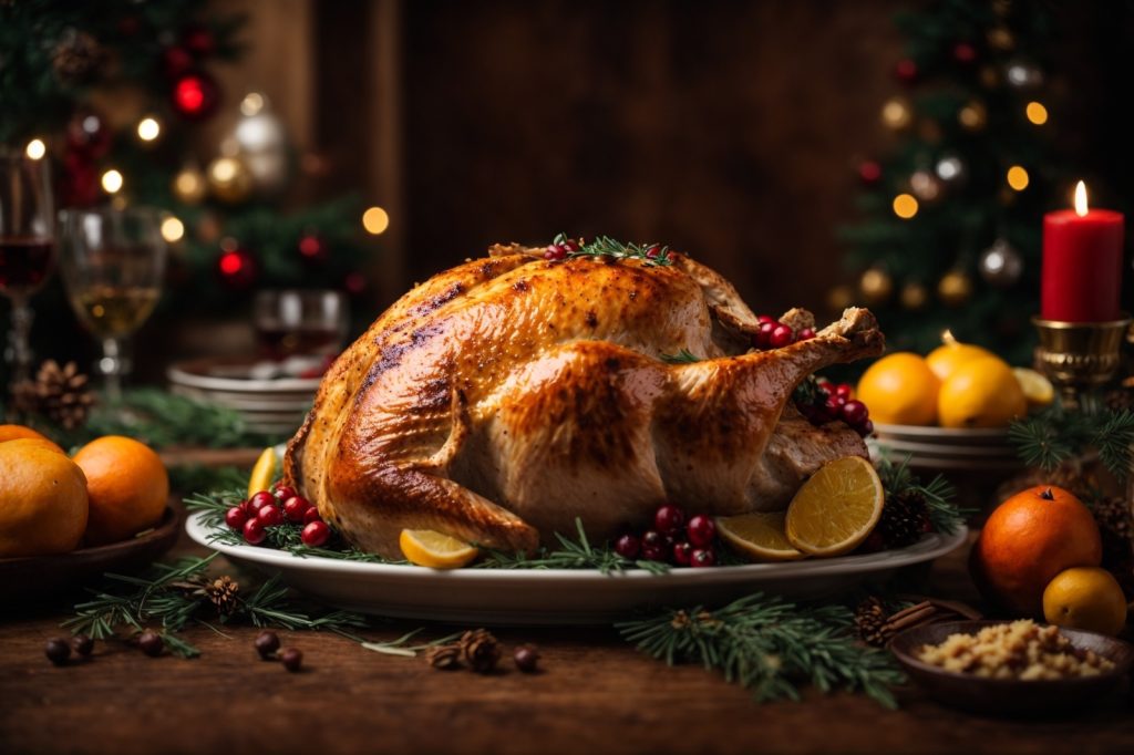 As proteínas disponíveis são peru com molho ao seu jus e cajuína, frango natalino com molho