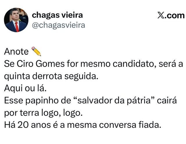 Na publicação, Chagas também questiona o discurso do pedetista e afirma que a imagem de “salvador da pátria” não se sustenta, classificando a trajetória recente como repetição de uma mesma narrativa ao longo de 20 anos. A declaração repercutiu rapidamente entre aliados e opositores.