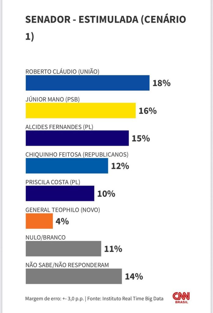 De acordo com o levantamento, Chiquinho Feitosa aparece com 12% das intenções de voto, desempenho que o coloca em condição de empate técnico com Roberto Cláudio (18%), Júnior Mano (16%) e Alcides Fernandes (15%). Considerando a margem de erro de três pontos percentuais, os quatro pré-candidatos aparecem muito próximos, configurando um dos cenários mais equilibrados da disputa majoritária no estado.