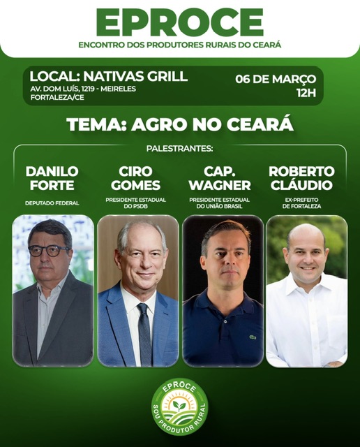 Nesta sexta-feira, 6 de março, o Encontro dos Produtores Rurais do Ceará (EPROCE) contará com a presença de Ciro Gomes, presidente estadual do PSDB, que se junta a outras importantes lideranças políticas, como o deputado federal Danilo Forte, o presidente estadual do União Brasil, Capitão Wagner, e o ex-prefeito de Fortaleza, Roberto Cláudio. O evento ocorrerá no Nativas Grill, em Fortaleza, a partir das 12h, e terá como tema “Agro no Ceará”.