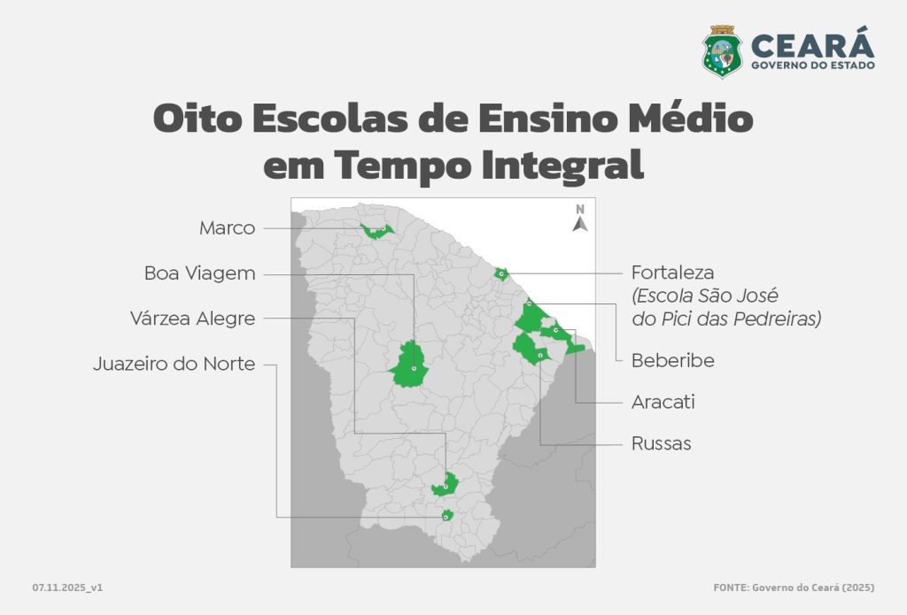 As unidades, que contemplam oito municípios, integram o pacote de 138 novas escolas planejadas pelo Governo do Ceará para atingir a meta de universalização. Atualmente, o Ceará tem 77% da rede estadual nesse modelo de ensino.