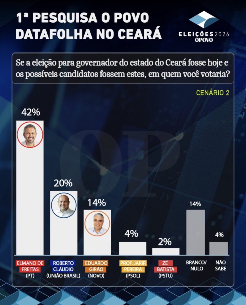 Em um segundo cenário, sem a presença de Ciro Gomes, Elmano de Freitas lidera com 42%, seguido por Roberto Cláudio, que aparece com 20%, e Eduardo Girão, com 14%. Professor Jarir Pereira soma 4% e Zé Batista 2%, enquanto 14% indicaram voto branco ou nulo e 4% não souberam responder.