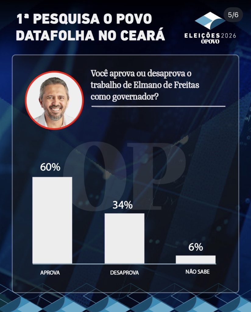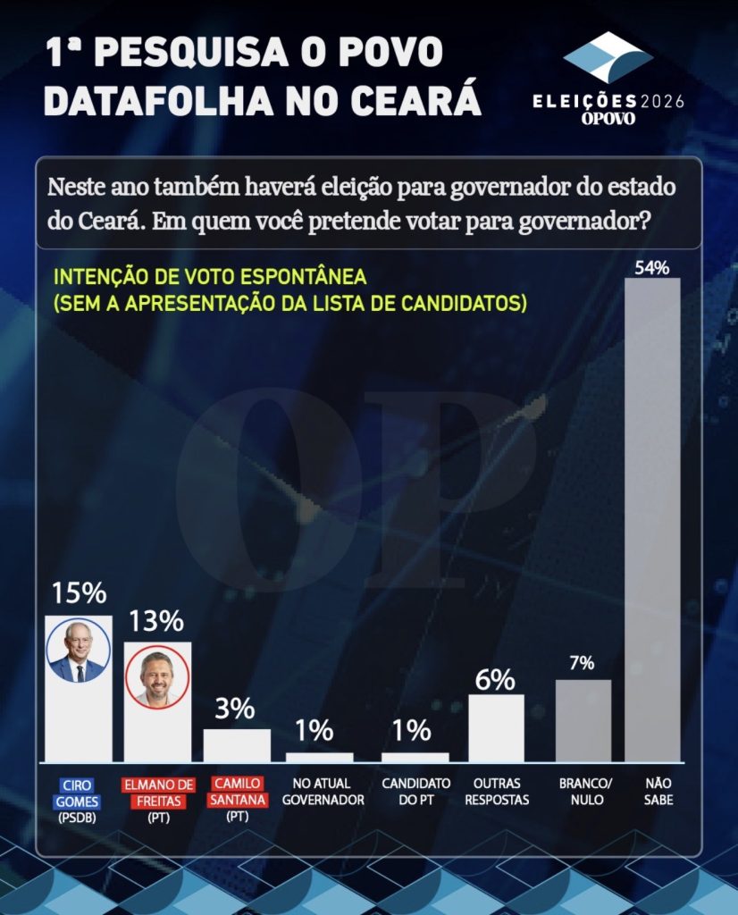 A pesquisa também mediu a avaliação do governo Elmano de Freitas, com 60% de aprovação, 34% de desaprovação e 6% que não souberam opinar. No levantamento espontâneo, quando não é apresentada lista de candidatos, 54% dos entrevistados disseram não saber em quem votar, enquanto Ciro Gomes aparece com 15%, Elmano com 13% e Camilo Santana com 3%.
