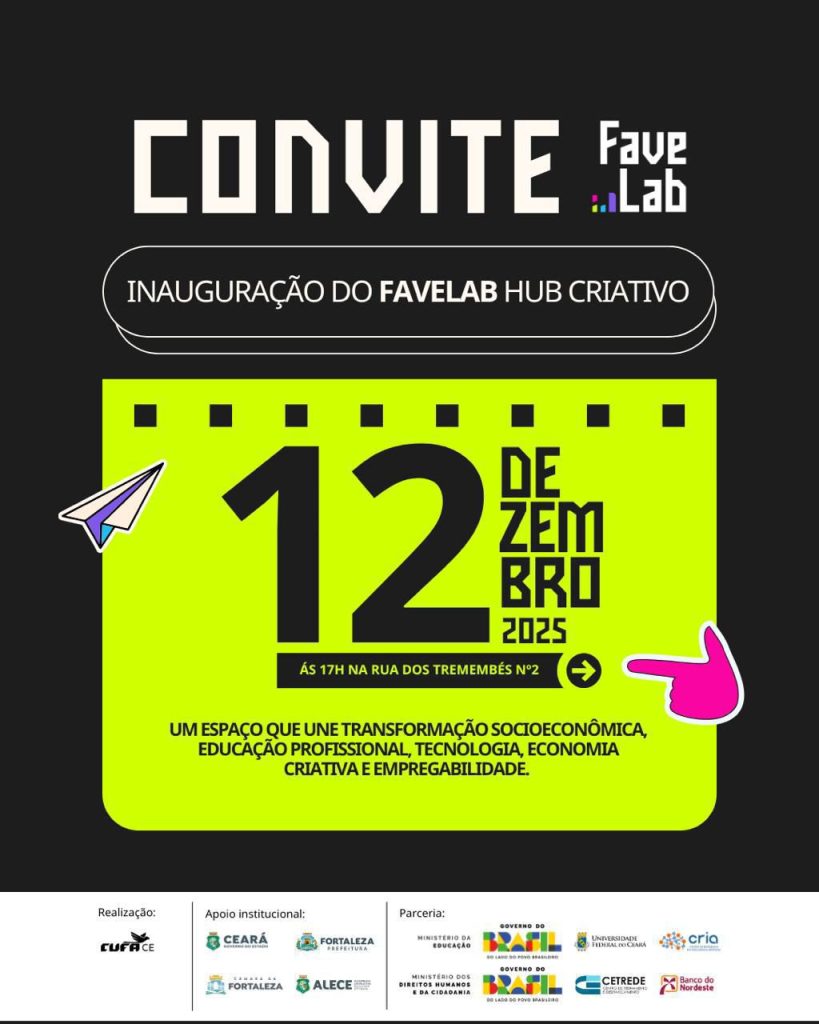 A Central Única das Favelas (CUFA) Ceará, em parceria com instituições governamentais e não-governamentais, apresenta para a sociedade nesta sexta-feira (12), às 17 horas, o FaveLab, um Hub Criativo que conecta empreendedorismo, criatividade, tecnologia, educação profissional, empregabilidade e cultura. O FaveLab – Hub Criativo funcionará na rua dos Tremembés, no 2, na Praia de Iracema, em um prédio localizado ao lado do Estoril, e nasce com a missão de ser um espaço de inovação e transformação, promovendo oportunidades e fortalecendo talentos que emergem das favelas e territórios criativos do Ceará.