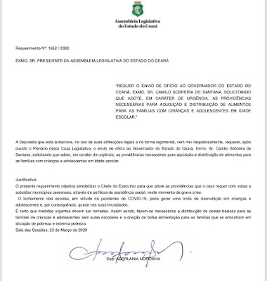 A Deputada Aderlânia Noronha (SD) solicitou, nesta segunda-feira (23), ao Governador Camilo Santana, em caráter de urgência, as providências necessárias para aquisição e distribuição de alimentos para as famílias com crianças e adolescentes matriculados na rede pública de ensino do Ceará.