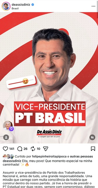 O deputado estadual De Assis Diniz anunciou, nesta quarta-feira, 15, que assumirá a vice-presidência nacional do Partido dos Trabalhadores (PT). O comunicado foi feito por meio das redes sociais, onde o parlamentar destacou a responsabilidade e a importância do novo cargo dentro da sigla.