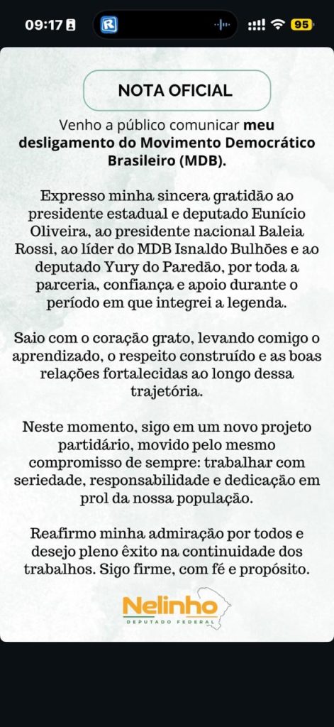 No comunicado, Nelinho adotou um tom de gratidão ao destacar sua trajetória dentro do MDB. O deputado agradeceu ao presidente estadual Eunício Oliveira, ao presidente nacional Baleia Rossi, ao líder na Câmara Isnaldo Bulhões e ao deputado Yury do Paredão, ressaltando a parceria e o apoio recebidos durante o período em que integrou o partido.