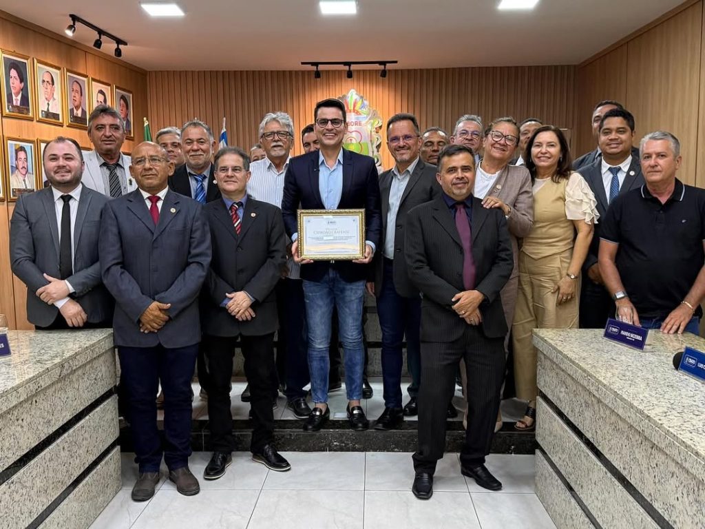 Nesta segunda-feira, 17, o deputado federal Yury do Paredão recebeu o Título de Cidadão do Crato, durante solenidade realizada no Palácio José Valdevino de Brito, sede do Poder Legislativo municipal. A cerimônia contou com a presença do prefeito do Crato, André Barreto, do presidente da Câmara Municipal, Matheus Leite, além de vereadores, autoridades políticas e diversas lideranças da região do Cariri.