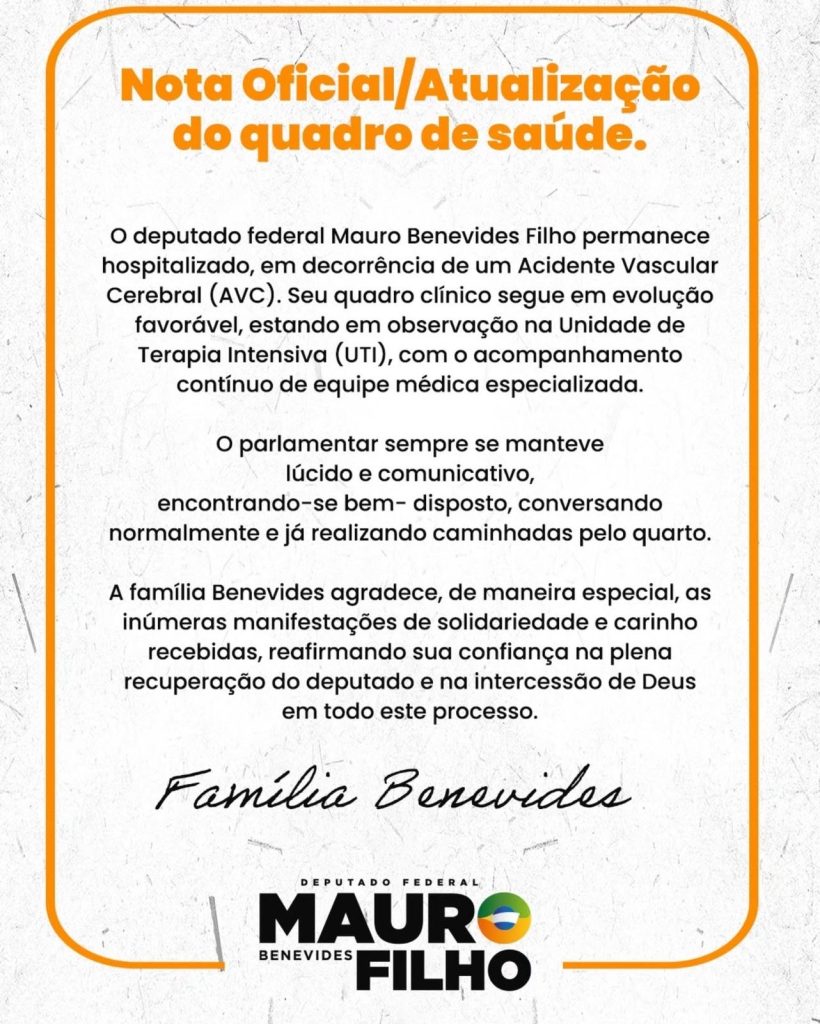 O deputado federal Mauro Benevides Filho permanece hospitalizado em decorrência de um Acidente Vascular Cerebral (AVC). Em comunicado divulgado em suas redes sociais oficiais, o parlamentar informou que seu quadro clínico segue em evolução favorável, estando em observação na Unidade de Terapia Intensiva (UTI) e recebendo acompanhamento contínuo de equipe médica especializada.