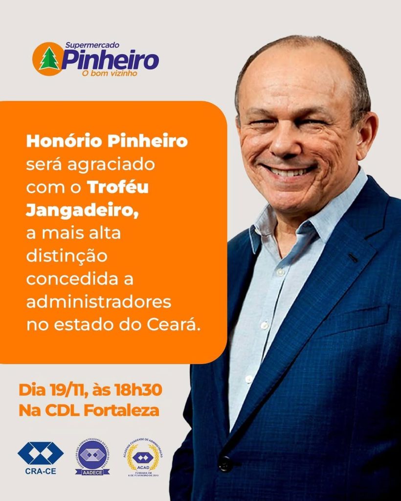 O administrador e empreendedor Honório Pinheiro será agraciado com o Troféu Jangadeiro, a mais alta distinção concedida a profissionais de destaque na área de administração no estado do Ceará. A solenidade será realizada no dia 19 de novembro, às 18h30, na CDL Fortaleza, reconhecendo uma trajetória marcada por liderança, inovação e compromisso com o desenvolvimento econômico e social.