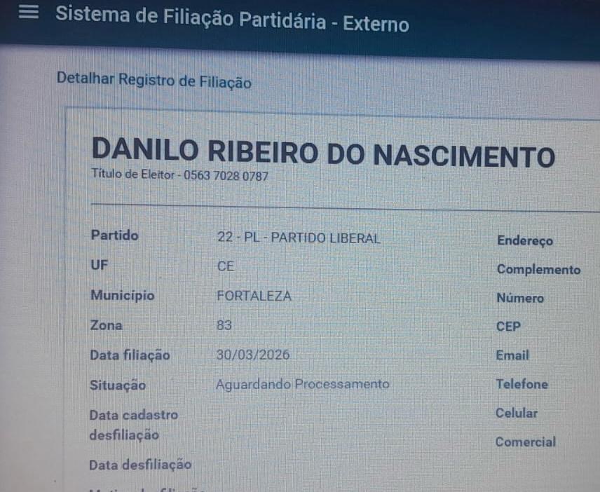 O ex-vereador de Fortaleza e atual conselheiro tutelar, Danilo Ribeiro, anunciou sua filiação ao Partido Liberal (PL). Em seu terceiro mandato como conselheiro, ele aceitou convite do deputado federal André Fernandes para integrar a sigla.