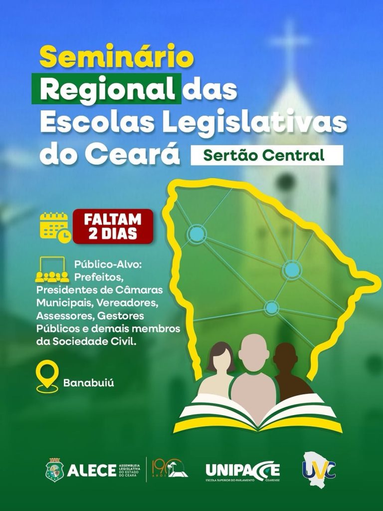Nos dias 29 e 30 de outubro, a partir das 8 horas, o município de Banabuiú sediará o Seminário Regional das Escolas Legislativas do Ceará – Sertão Central, promovido pela Unipace, com o objetivo de fortalecer a atuação do poder legislativo municipal por meio da formação continuada e do intercâmbio de experiências.