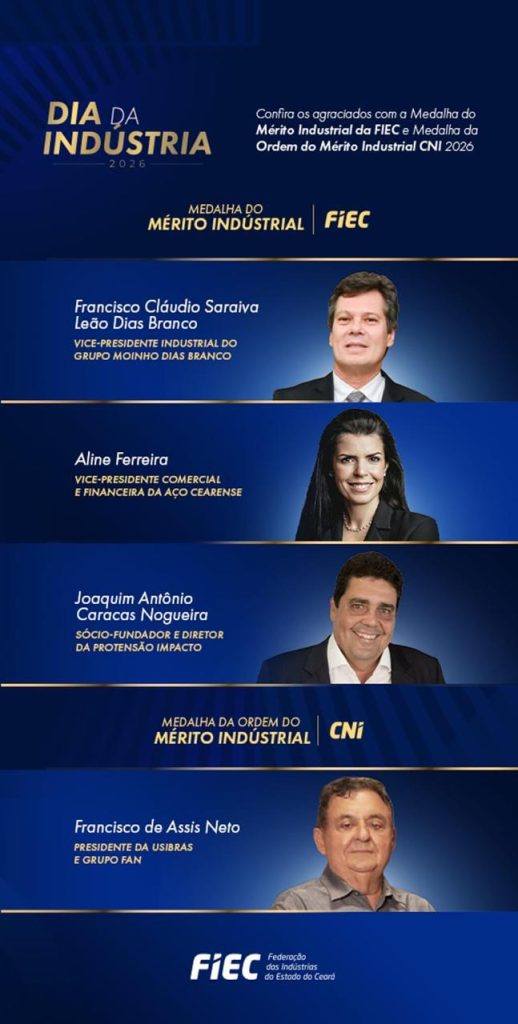 Já a Medalha da Ordem do Mérito Industrial da CNI será concedida a Francisco de Assis Neto, presidente da Usibras e do Grupo FAN. As homenagens integram a programação do Dia da Indústria 2026 e reforçam o papel estratégico do setor industrial para o crescimento econômico e social do Ceará e do Brasil.