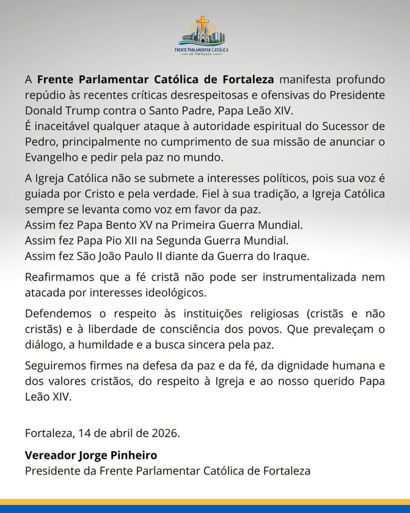 A Frente Parlamentar Católica de Fortaleza, presidida pelo vereador Jorge Pinheiro, publicou nesta terça-feira, 14, uma nota oficial de repúdio criticando declarações atribuídas ao ex-presidente dos Estados Unidos, Donald Trump, contra o Papa Leão XIV.
