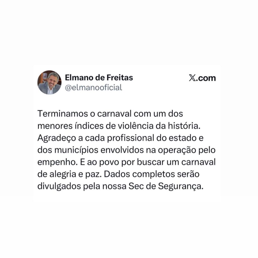 Na publicação, o governador agradeceu aos profissionais do Estado e dos municípios envolvidos na operação de segurança, destacando o empenho das equipes durante os dias de folia. Ele também reconheceu o comportamento da população, afirmando que o povo buscou um carnaval de alegria e paz.