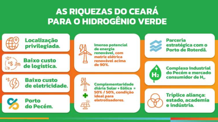 Durante sua fala, o governador Elmano de Freitas também apresentou o potencial do Ceará na agenda do Hidrogênio Verde (H2V), destacando nove pontos estratégicos que evidenciam os benefícios do estado, desde sua localização privilegiada até as parcerias consolidadas e a infraestrutura logística.