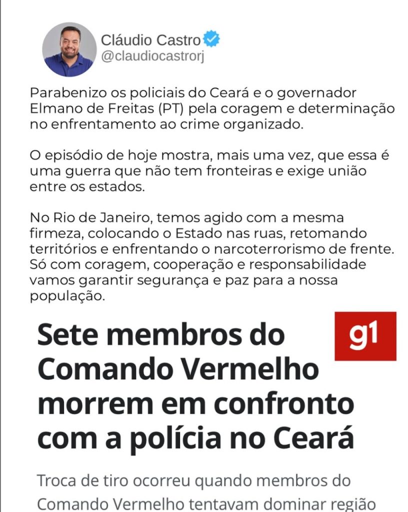 Nas redes sociais, o governador Cláudio Castro parabenizou Elmano e a PMCE pela ação, afirmando que o enfrentamento ao crime organizado exige união entre os estados. Ele destacou que o crime não tem fronteiras e que o trabalho conjunto fortalece o combate às facções no país.