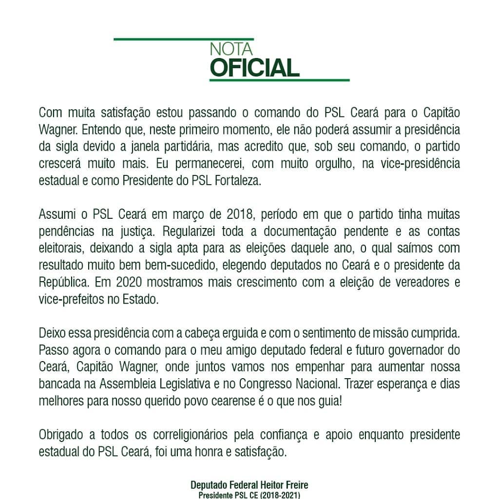 O deputado Federal Heitor Freire soltou uma nota oficial em passa o comando do PSL Ceará para Capitão Wagner. Ainda de acordo com a nota, por questões técnicas, neste momento Wagner não poderá assumir à presidência.