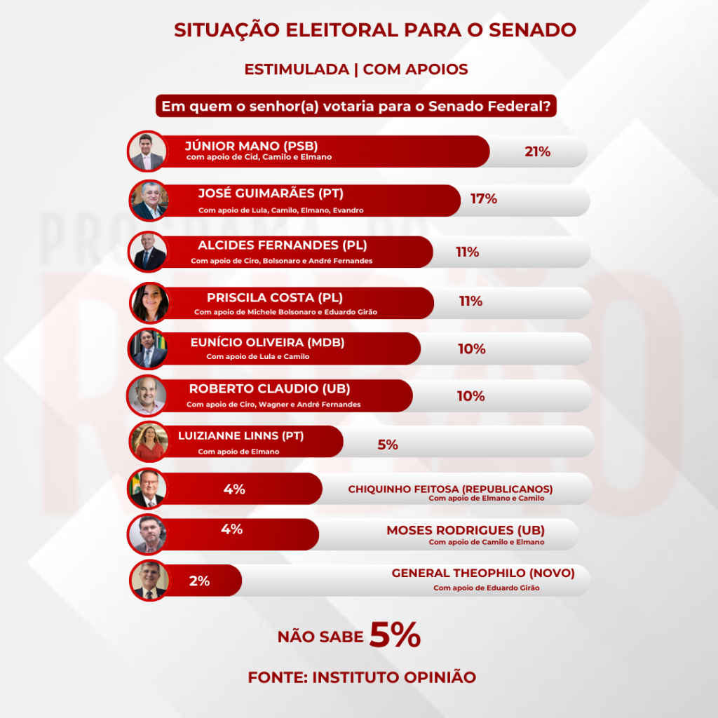 Júnio Mano (PSB) aparece com 21% das intenções de voto, seguido por José Guimarães (PT), que registra 17%. Alcides Fernandes (PL) e Priscila Costa (PL) surgem empatados com 11%, enquanto Eunício Oliveira (MDB) e Roberto Cláudio (UB) pontuam 10% cada.