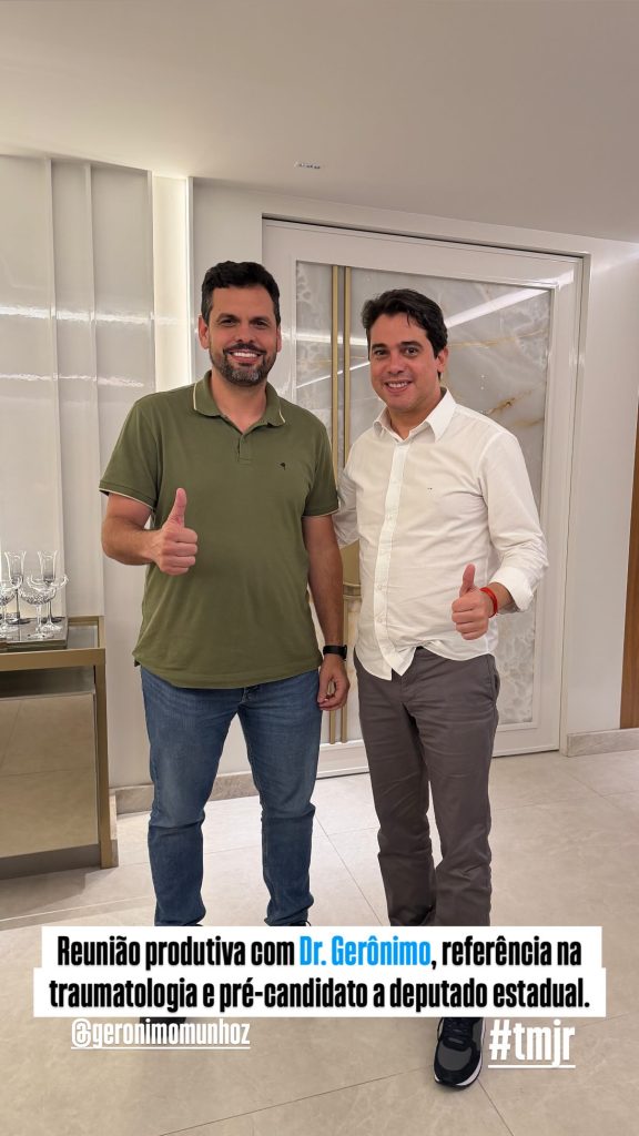 O deputado federal Júnior Mano publicou em suas redes sociais um registro ao lado de Dr. Gerônimo, pré-candidato a deputado estadual. A imagem, divulgada pelo parlamentar, sinaliza movimentação política e diálogo entre lideranças com atuação em diferentes frentes no Ceará.