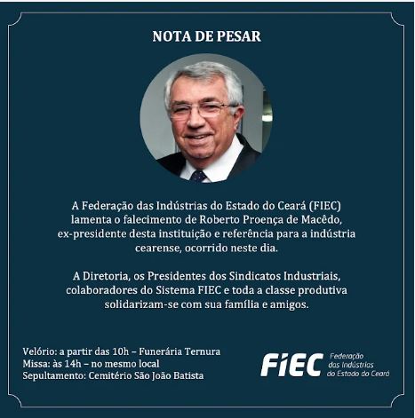 A indústria cearense perdeu, nesta terça-feira (11), um de seus maiores nomes. A Federação das Indústrias do Estado do Ceará (Fiec) anunciou o falecimento do empresário Roberto Proença de Macêdo, 81 anos, ex-presidente da entidade e atual presidente do Conselho de Administração do Grupo J. Macêdo. A Fiec decretou luto oficial de três dias.