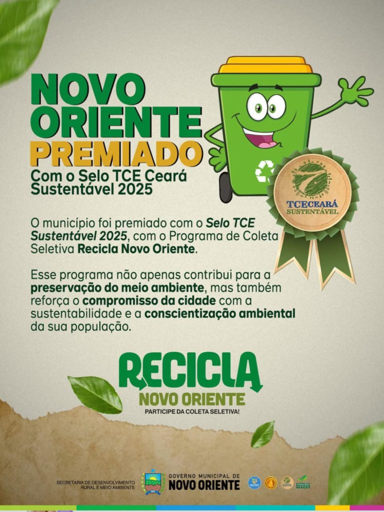 Enquanto o Brasil protagoniza as discussões globais sobre o futuro do planeta durante a COP 30, realizada em Belém (PA), o município de Novo Oriente, localizado a 398,2 km de Fortaleza, celebra uma conquista emblemática para o Ceará: o reconhecimento com o Selo TCE Ceará Sustentável 2025, concedido pelo Tribunal de Contas do Estado (TCE-CE). O município foi agraciado pelo desempenho do Programa Recicla Novo Oriente, que, em apenas três meses de implantação, já apresenta resultados expressivos na gestão de resíduos sólidos urbanos e na inclusão social de catadores.