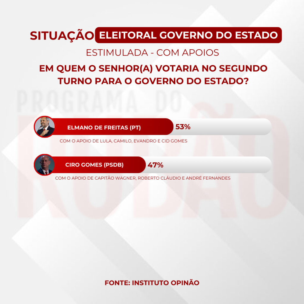 No primeiro cenário de segundo turno, a pesquisa mostra um confronto direto entre Elmano de Freitas e Ciro Gomes. O governador aparece com 53% das intenções de voto, enquanto Ciro registra 47%, indicando uma disputa equilibrada e dentro da margem de competitividade.