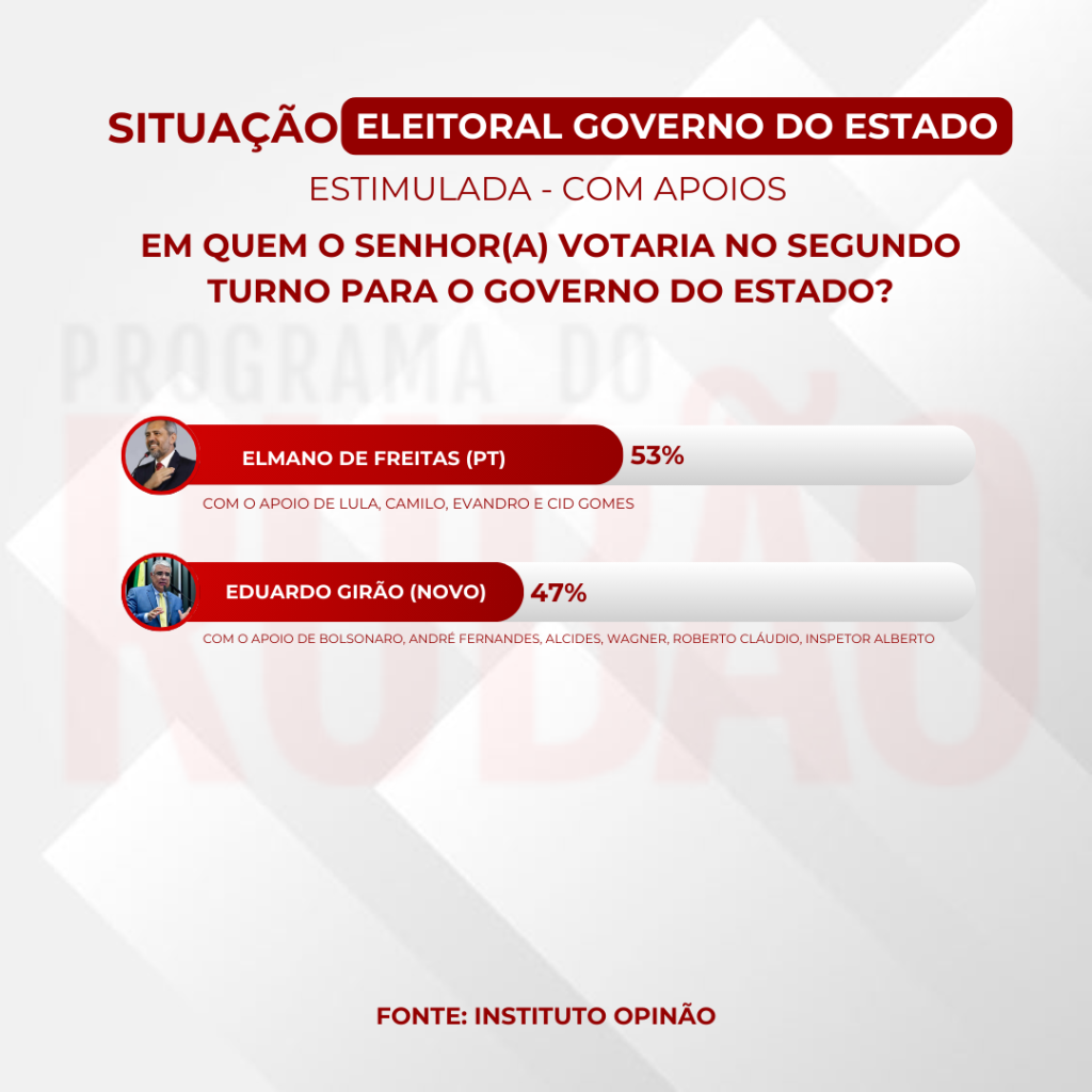 Já no segundo cenário de segundo turno testado pelo instituto, Elmano mantém 53% das intenções de voto contra 47% de Eduardo Girão. O resultado reforça a liderança do atual governador e aponta que, apesar da vantagem, os cenários projetam disputas apertadas na etapa final da eleição.