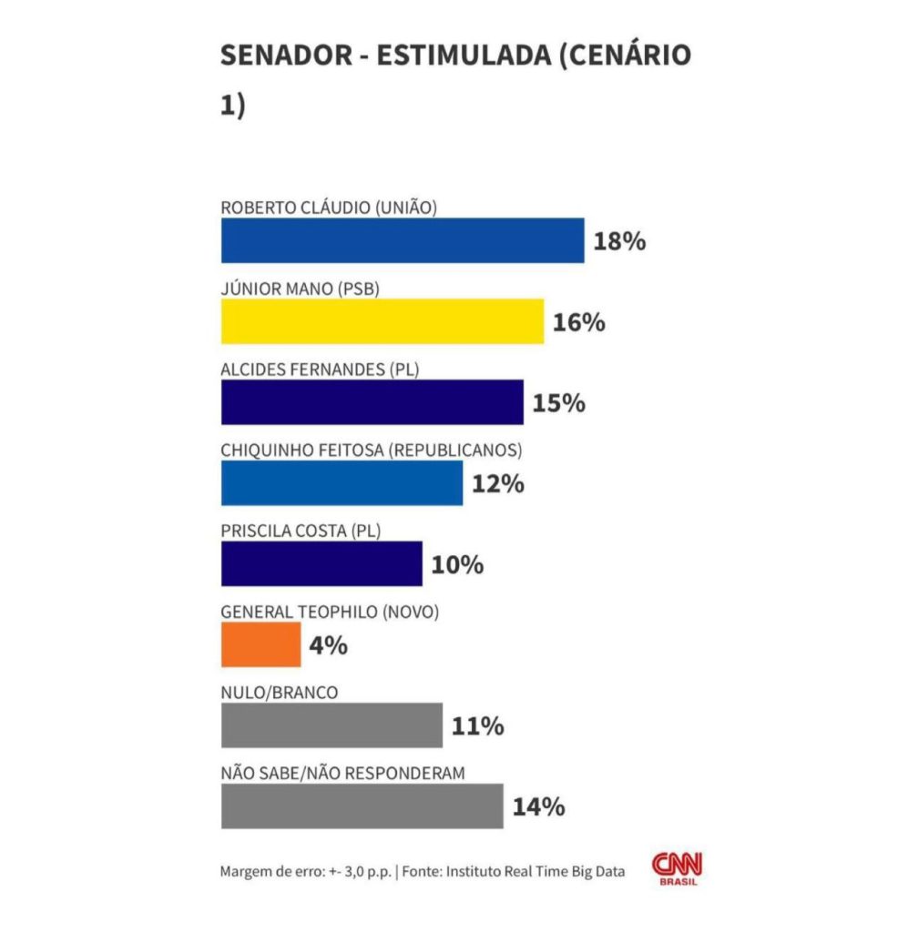 O levantamento também aponta Priscila Costa (10%) e General Theophilo (4%), além de 11% de votos nulos/brancos e 14% de eleitores indecisos. Os resultados reforçam que a disputa pelo Senado deve ser uma das mais acirradas de 2026, com movimentações importantes ainda por acontecer.