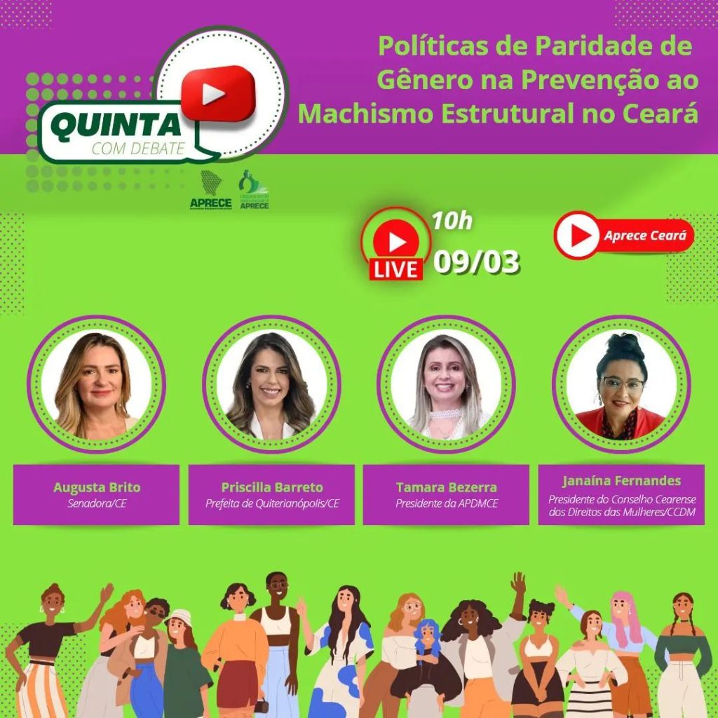 A Quinta com Debate da Aprece anunciou que o tema para o próximo encontro será a importância da implementação de políticas públicas, no âmbito dos municípios, que fomentam a paridade de gênero como forma de prevenção e combate ao machismo estrutural.