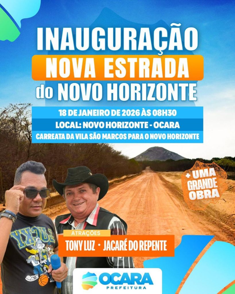 O prefeito de Ocara, Dr. Leonildo Farias, inaugura no próximo domingo, 18 de janeiro, às 8h30, a nova estrada do Novo Horizonte. A obra representa um avanço importante para a mobilidade da população, facilitando o deslocamento de moradores e fortalecendo a integração da comunidade com outras regiões do município.