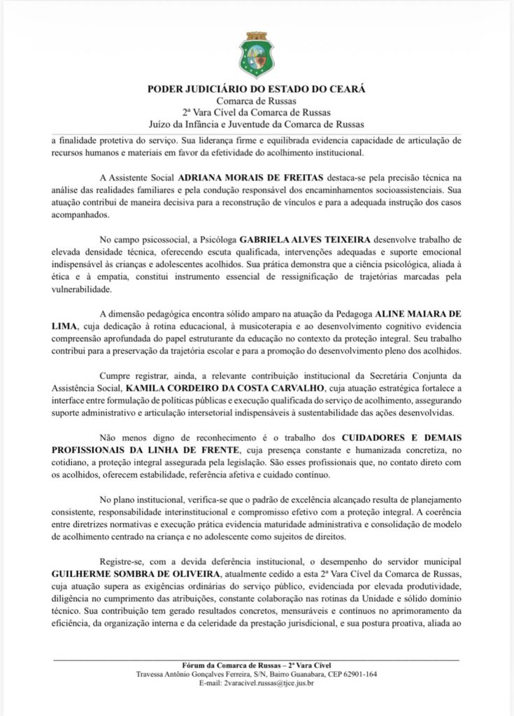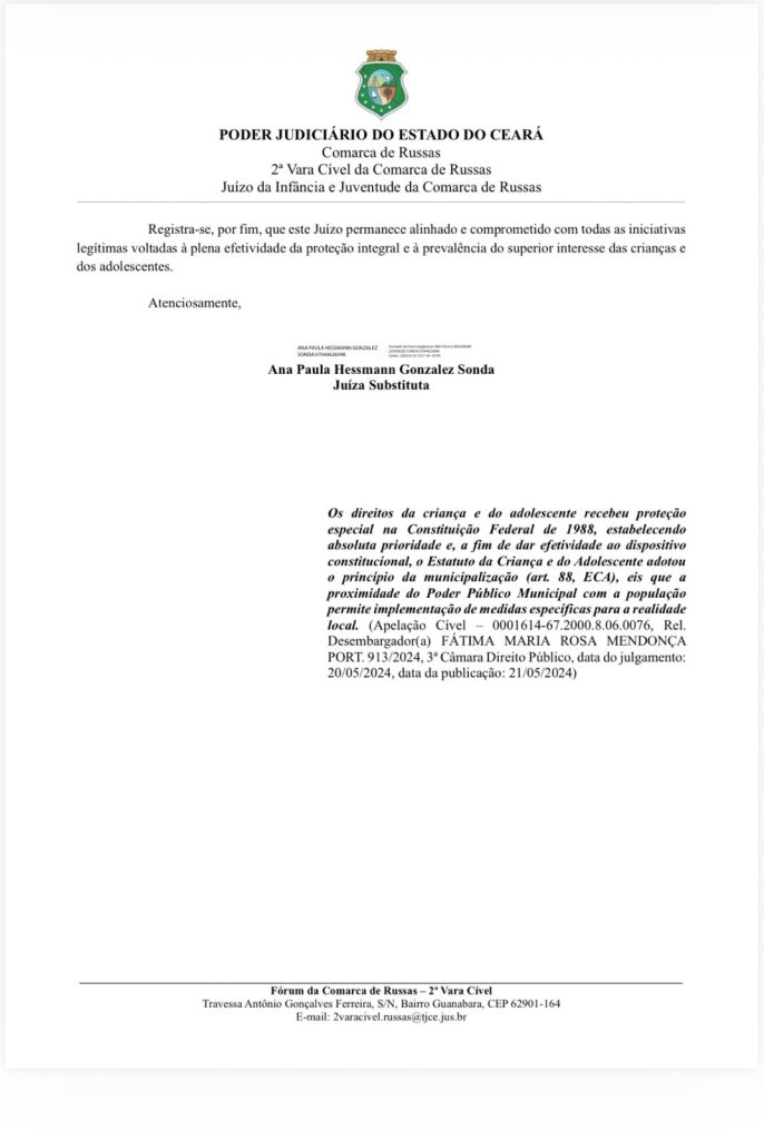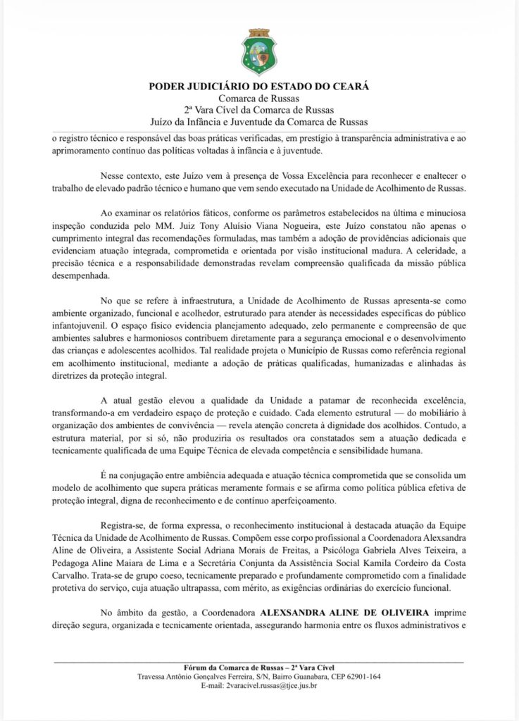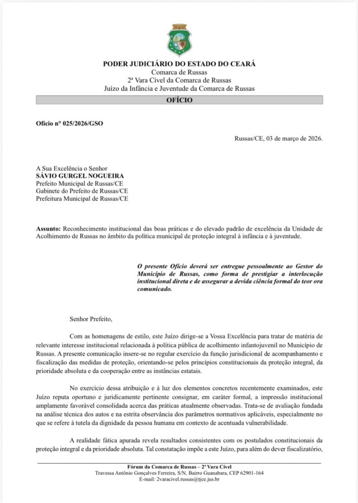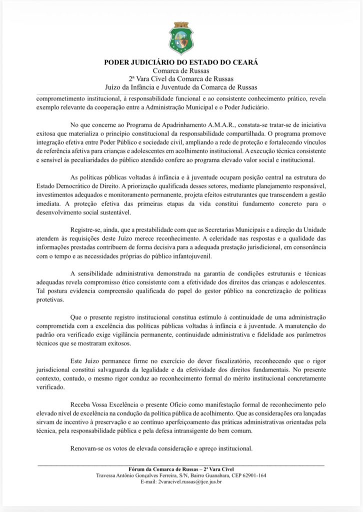 A manifestação foi formalizada por meio de ofício enviado pela 2ª Vara Cível e pelo Juízo da Infância e Juventude da Comarca de Russas, assinado pela juíza substituta Dra. Ana Paula Hessmann Gonzalez Sonda. No documento, o Judiciário destaca que a unidade apresenta atualmente um ambiente organizado, funcional e adequado às necessidades de crianças e adolescentes acolhidos.