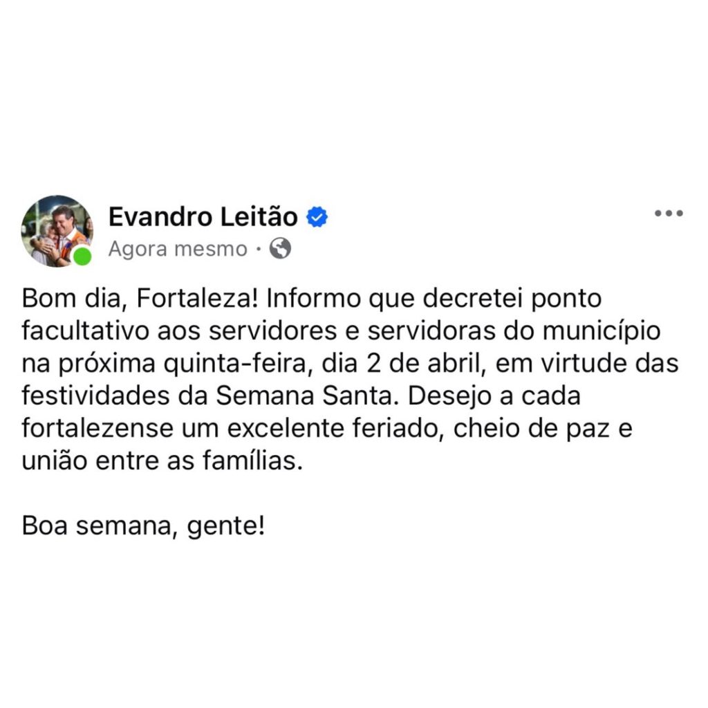 O prefeito de Fortaleza, Evandro Leitão, anunciou nesta segunda-feira (30) a decretação de ponto facultativo para os servidores municipais na próxima quinta-feira, 2 de abril, em virtude das celebrações da Semana Santa.