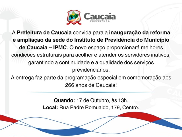 Às 13h, será inaugurada a nova sede do Instituto de Previdência do Município de Caucaia (IPMC), na Rua Padre Romualdo, 179, no Centro. Totalmente reformado e ampliado, o espaço vai garantir melhores condições para o atendimento aos servidores inativos, assegurando a continuidade e a qualidade dos serviços previdenciários.