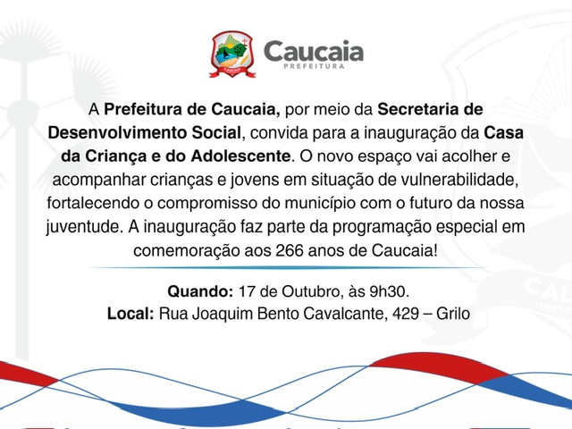 A primeira entrega do dia será a Casa da Criança e do Adolescente, às 9h30, localizada na Rua Joaquim Bento Cavalcante, 429, no bairro Grilo. O novo espaço, coordenado pela Secretaria de Desenvolvimento Social, vai acolher e acompanhar crianças e jovens em situação de vulnerabilidade, fortalecendo políticas públicas voltadas à juventude caucaiense.