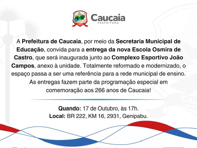 Encerrando o dia de entregas, às 17h, a Prefeitura entrega a nova Escola Osmira de Castro, localizada na BR-222, KM 16, 2931, em Genipabu, juntamente com o Complexo Esportivo João Campos, anexo à unidade. O espaço foi completamente reformado e modernizado, tornando-se uma referência para a rede municipal de ensino. A obra é coordenada pela Secretaria Municipal de Educação.