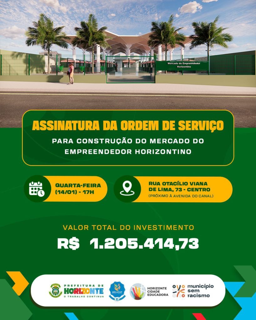 A Prefeitura de Horizonte realiza nesta quarta-feira (14/01), às 17h, a assinatura da ordem de serviço para a construção do Mercado do Empreendedor Horizontino. O novo equipamento será implantado na Rua Otacílio Viana de Lima, nº 73, no Centro da cidade, próximo à Avenida do Canal.