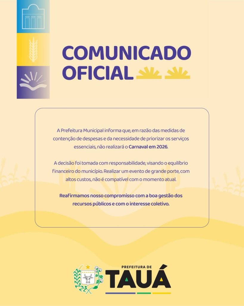 Na manhã desta segunda-feira, 5, a Prefeitura de Tauá publicou um comunicado oficial informando que o município não realizará o Carnaval em 2026. A decisão foi tomada com foco no equilíbrio financeiro e no compromisso com a boa gestão dos recursos públicos.