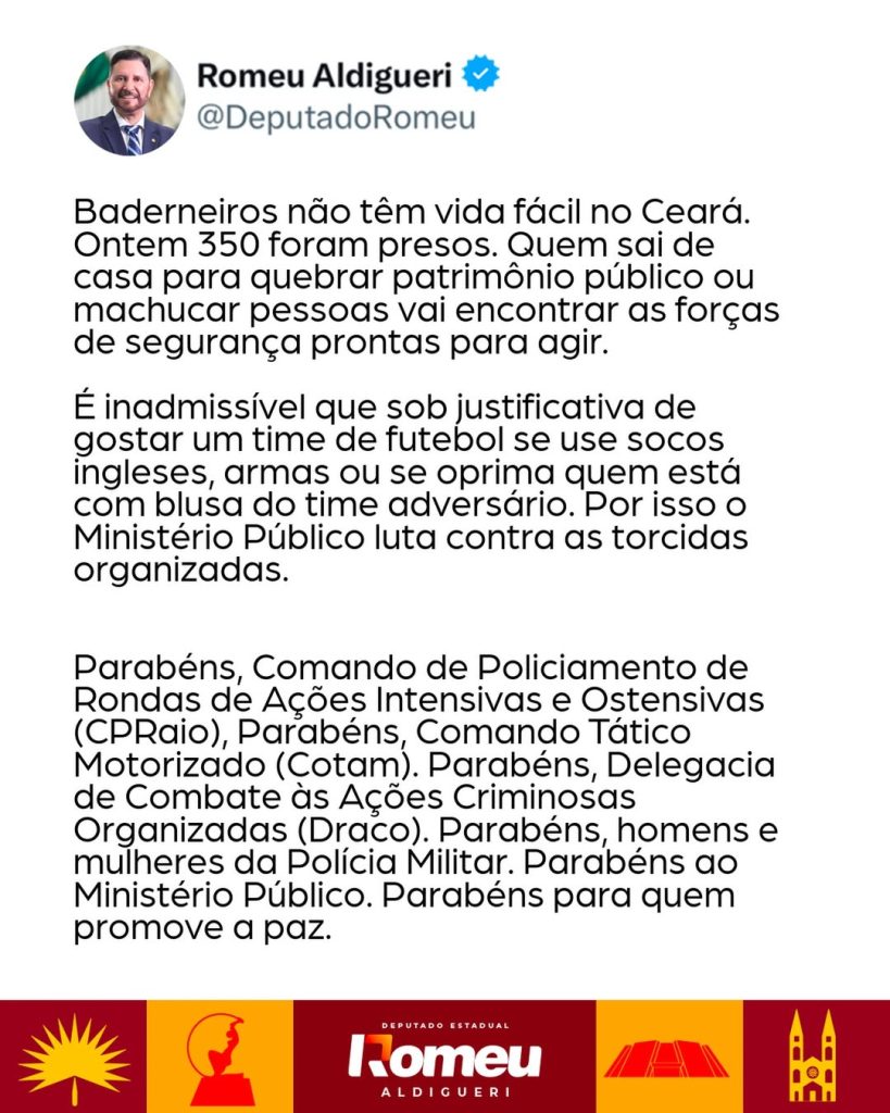 O presidente da Assembleia Legislativa do Ceará, Romeu Aldigueri, utilizou as redes sociais nesta segunda-feira (09) para comentar a atuação das forças de segurança do Estado no enfrentamento à violência, especialmente a ações de vandalismo e confrontos associados a torcidas organizadas. Segundo ele, somente no domingo, 350 pessoas foram presas no Ceará.