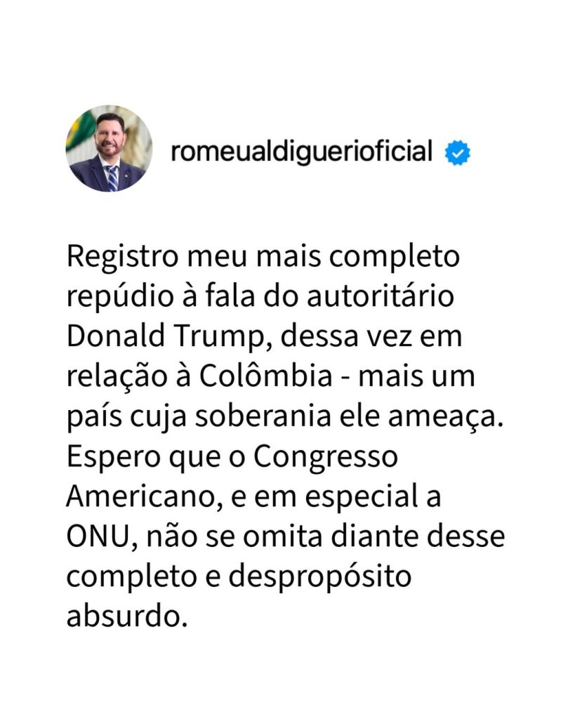 O presidente da Assembleia Legislativa do Ceará, Romeu Aldigueri, usou as redes sociais nesta segunda-feira (5) para manifestar repúdio às declarações do ex-presidente dos Estados Unidos, Donald Trump, direcionadas à Colômbia. Segundo Aldigueri, a fala representa mais uma ameaça à soberania de países da América Latina.