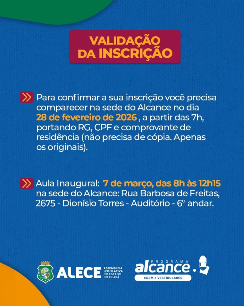 Para concluir a inscrição, os candidatos devem validar presencialmente o cadastro no dia 28 de fevereiro de 2026, a partir das 7h, na sede do Alcance, localizada no Edifício Deputado José Euclides Ferreira Gomes (Anexo II da Alece), na Rua Barbosa de Freitas, 2.675, no bairro Dionísio Torres, em Fortaleza, apresentando RG, CPF e comprovante de residência.