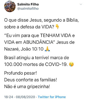 Em suas redes sociais, Salmito Filho lamenta o fato citando Jesus de Nazaré em João 10:10. “ Eu vim para que TENHAM VIDA e VIDA em ABUNDÂNCIA.”