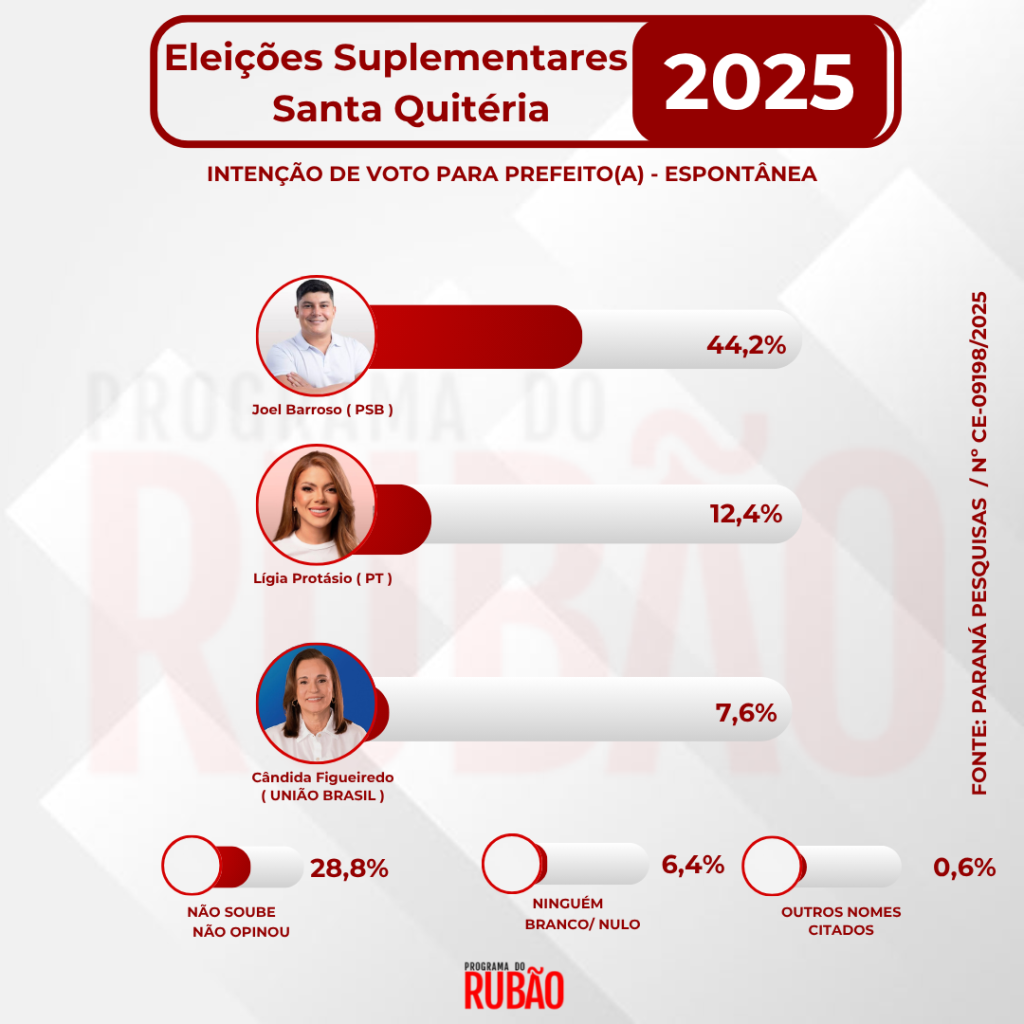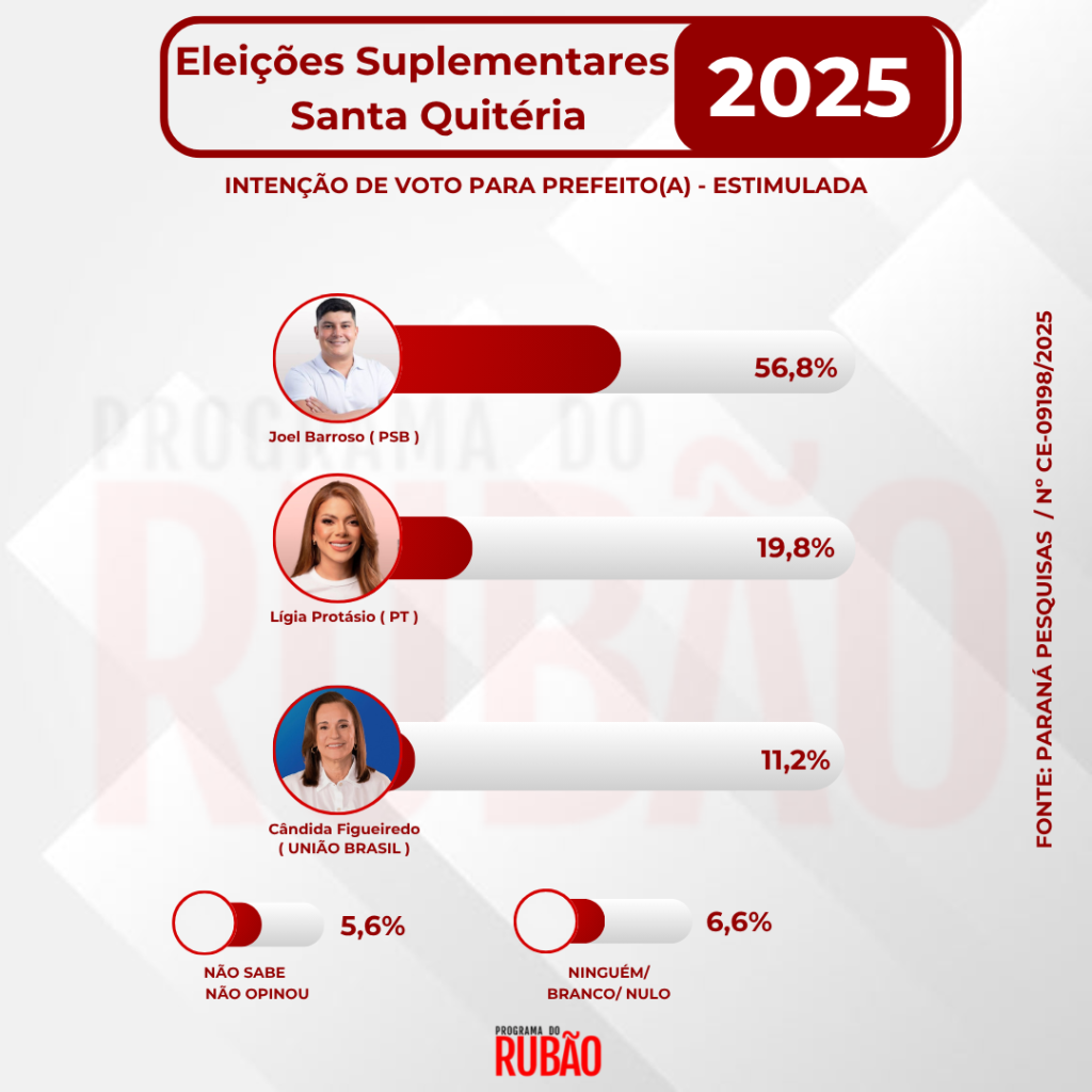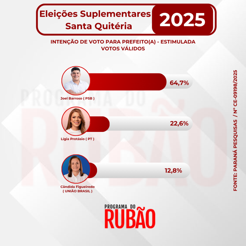 O grupo Plus FM divulgou nesta segunda-feira, 20 de outubro, pesquisa eleitoral sobre as eleições suplementares de Santa Quitéria, realizada pelo Instituto Paraná Pesquisas. O levantamento foi registrado na Justiça Eleitoral sob o número CE-09198/2025. Ao todo, foram entrevistados 500 eleitores entre os dias 15 e 18 de outubro de 2025. A pesquisa possui margem de erro de 4,95 pontos percentuais, para mais ou para menos, e nível de confiança de 95%.