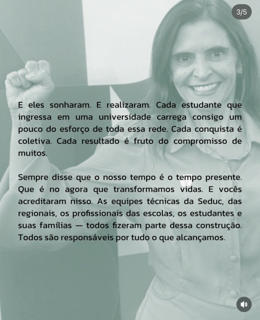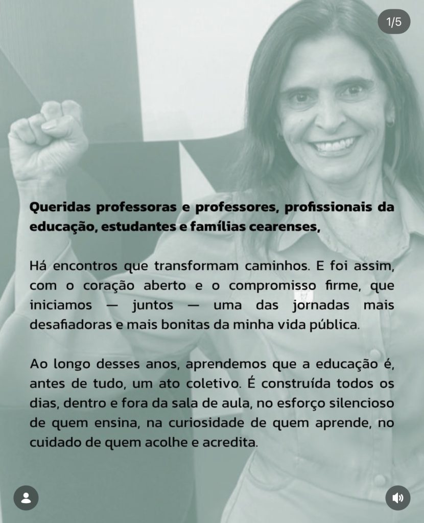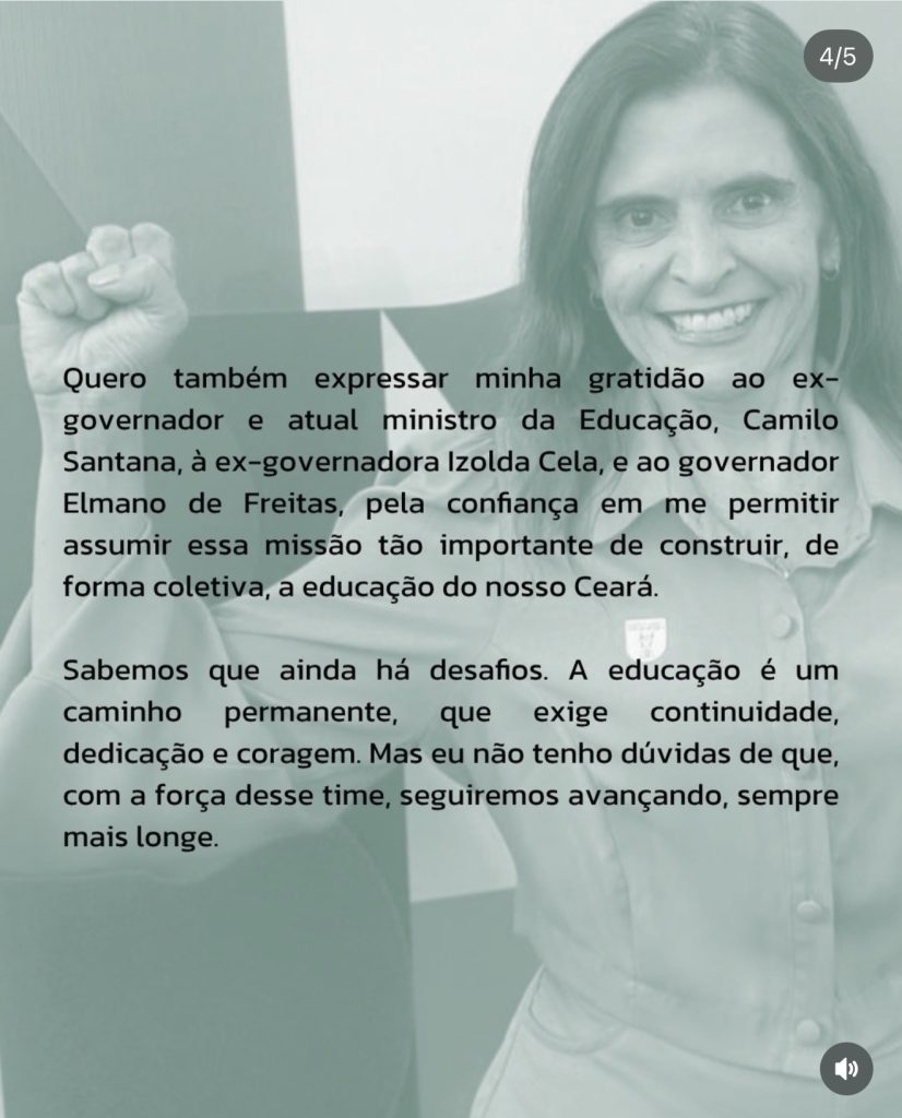 No texto, Eliana destacou que o período foi marcado por desafios e conquistas, ressaltando o trabalho coletivo da rede de ensino. “Foram mais de sete anos de muito trabalho, mas, principalmente, de propósito”, escreveu, ao lembrar a atuação conjunta de professores, estudantes, gestores e famílias na construção dos resultados da educação no Ceará.