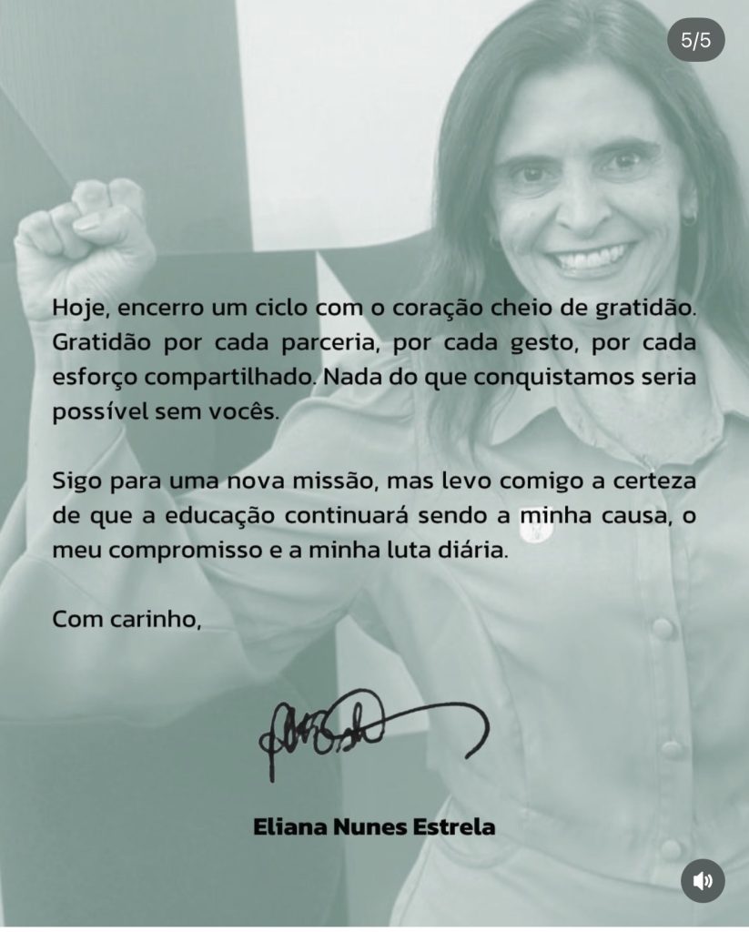 A secretária estadual da Educação do Ceará, Eliana Nunes Estrela, publicou na noite desta quarta-feira, 1º, uma carta aberta nas redes sociais em que anunciou sua saída da pasta. Na mensagem, a gestora afirmou: “Sigo para uma nova missão”, indicando o encerramento de um ciclo de mais de sete anos à frente da educação estadual.