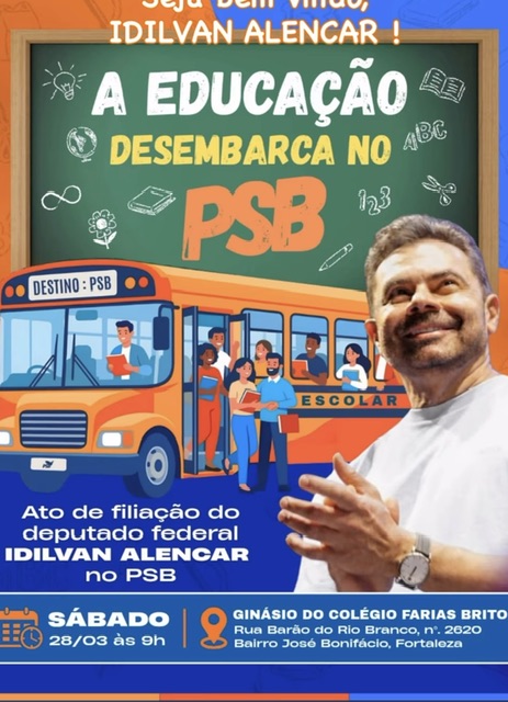 Atualmente filiado ao PDT, Idilvan deve oficializar sua entrada no PSB em um evento marcado para o dia 28 de março, às 9h, no ginásio do Colégio Farias Brito, no bairro José Bonifácio, em Fortaleza. A mobilização política foi divulgada com o slogan “A educação desembarca no PSB”, destacando a trajetória do gestor na área educacional.