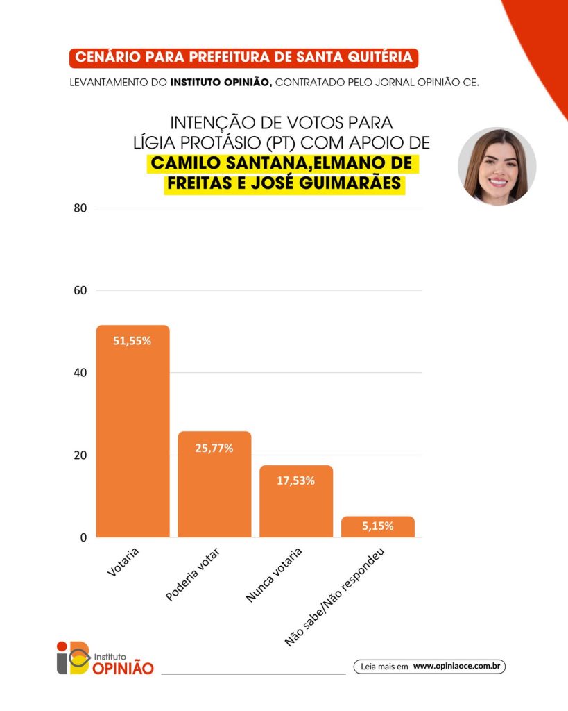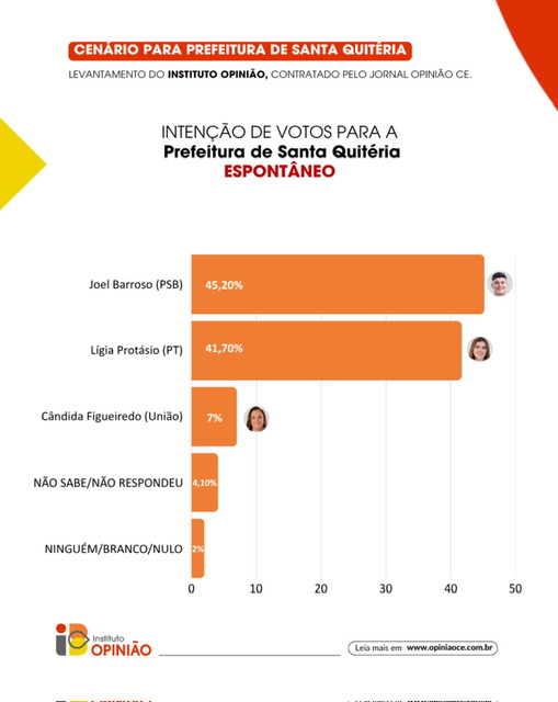 A eleição suplementar de Santa Quitéria, marcada para o próximo domingo (26), apresenta um cenário de forte equilíbrio entre os dois principais candidatos. Pesquisa realizada pelo Instituto Opinião aponta empate técnico entre Joel Barroso (PSB) e Lígia Protásio (PT), tanto no cenário estimulado quanto no espontâneo, dentro da margem de erro de cinco pontos percentuais.