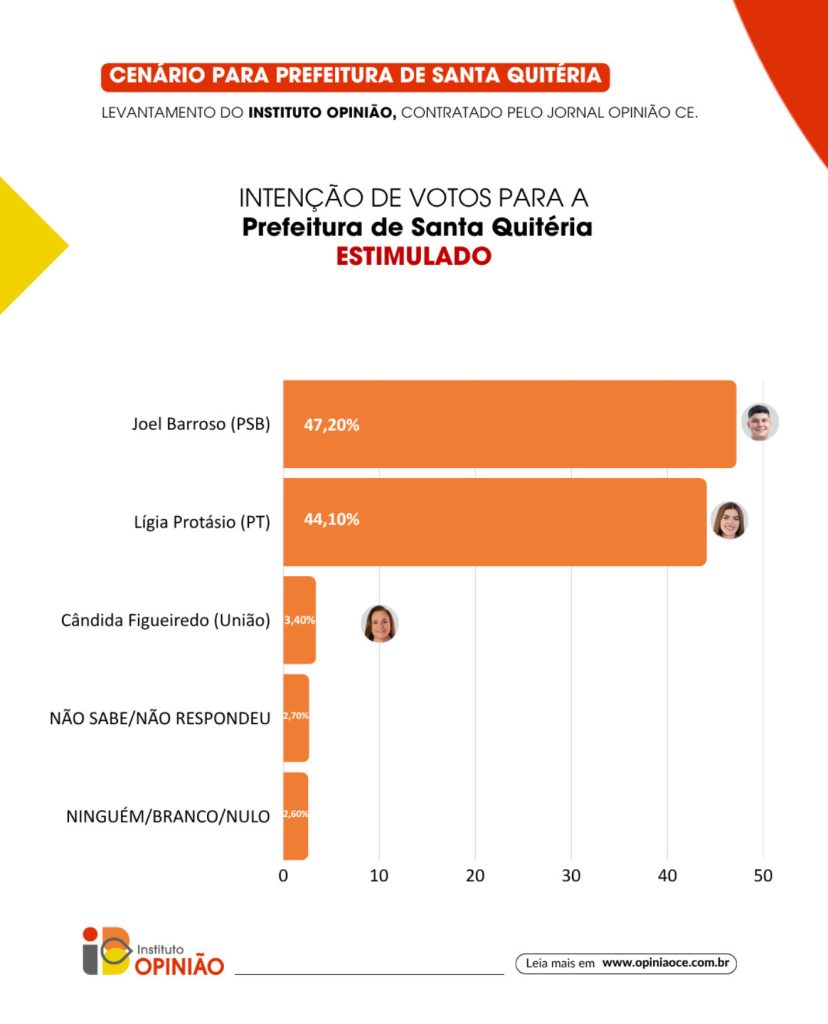 No cenário estimulado — quando os nomes são apresentados aos eleitores — Joel Barroso aparece com 47,20% das intenções de voto, enquanto Lígia Protásio registra 44,10%. A candidata Cândida Figueiredo (União Brasil) tem 3,40%. Outros 2,70% não souberam ou não responderam, e 2,60% declararam voto em branco, nulo ou em nenhum dos candidatos.