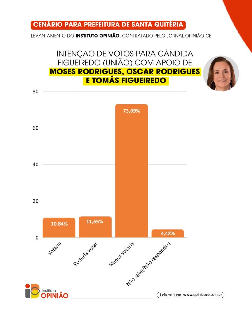 A pesquisa foi contratada pelo portal Opinião CE e realizada entre os dias 15 e 17 de outubro, com 400 entrevistados. O nível de confiança é de 95% e a margem de erro é de cinco pontos percentuais, para mais ou para menos. O levantamento está registrado no Tribunal Superior Eleitoral (TSE) com o número CE-01676/2024.